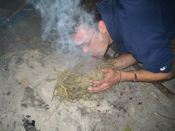 Foto: Lenaia-Lagerleiter beim Ausbreiten der Glut nach dem Feuerbohren