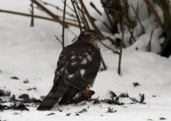 Letztes Jahr hat vermutlich der selbe Vogel bei uns ebenfalls eine Amsel geschlagen und zerzupft - im Kofferraum meines Autos, den ich nur einige Minuten offen gelassen hatte. Die Sauerei wegzumachen war nicht besonders angenehm, wir hatten aber damit gewartet, bis er seine Beute verschlungen hatte.