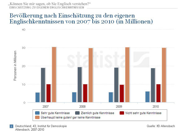 Für alle, die bisweilen von Anglizismen genervt sind aber nicht nachvollziehen können, wie es deswegen zu ernsthaften Verstimmungen kommen kann, die folgende Auswertung einer repräsentativen Allensbach-Umfrage zur Selbsteinschätzung der Englischkenntnisse (Quelle: Spiegel, n=>20.000).