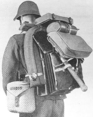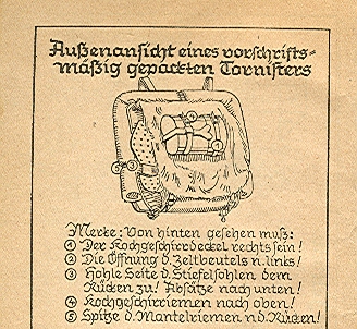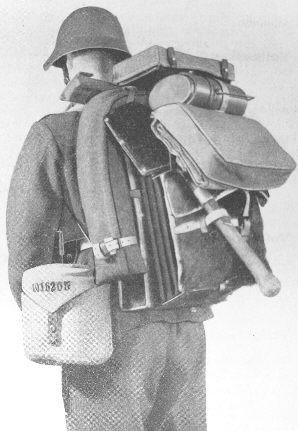 Gelernt habe ich jetzt also, dass "der Affen-Jünger" seinen Stahlhelm oben auf dem Affen trägt, aber Seitengewehr und Magazintaschen in den Affen hinein gehören. Aber wie trägt er nun die übrige Bewaffnung wie Gewehr/Maschinengewehr und Klappspaten?
