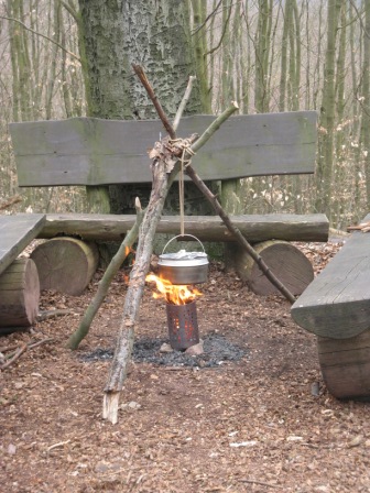 Wir haben am letzten Wochenende den IKEA-Hobo ausprobiert, noch unbearbeitet, einfach auf Steine gestellt und den Topf ans Dreibein gehängt. Funktioniert perfekt, schneller und rauchfreier als ein einfaches Feuer. Mit relativ feuchtem Holz haben wir einen Liter Wasser in ca. 15 Minuten zum Kochen gebracht.