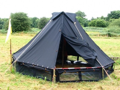 Nach längeren Überlegungen Kohten in Standlagern heller, luftiger und im Nutzvolumen "größer" zu haben, setzen wir im Stamm mittlerweile statt erhöhtem Erdstreifen (die unsere Kohtenbahnen nicht haben) Fensterbahnen ein. Als Beispiel seht ihr hier ein Bild unserer gestempelten Zeltkirche in Irland 2008. Selbst bei dem häufigen Regen konnten die Gazefenster meist offen bleiben. Diese Kohte wurde nach "Jurten-Art" aufgebaut: Erst die Fenster-/Seitenbahnen aufstellen, dann das Dach hochziehen/-drücken.