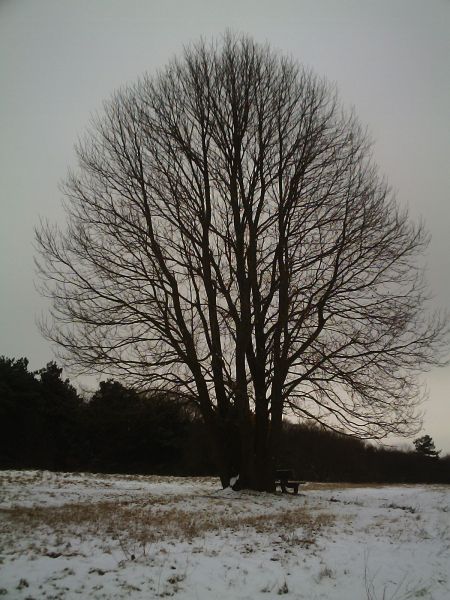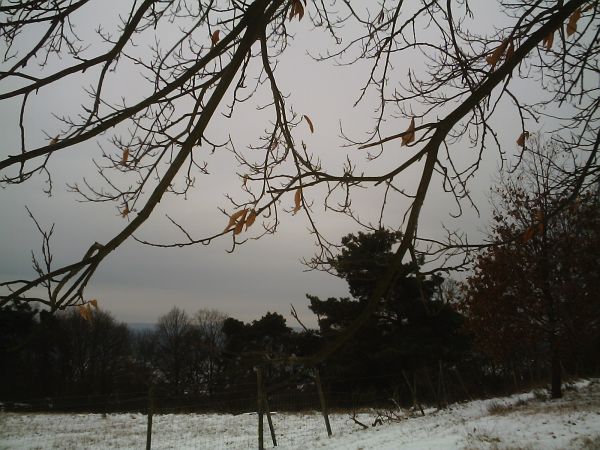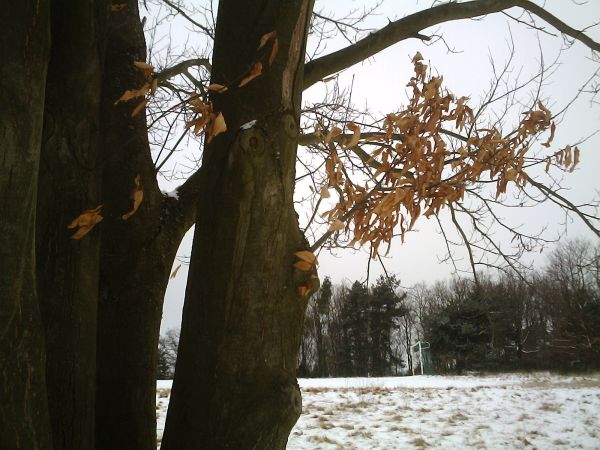 Schwer, ich weiss. Ohne Blätter und in der Morgendämmerung des 6.1.09. Deshalb noch zwei Bilder dazu mit vertrockneten Blättern und Borke. Wer weiss es? Hinweis: die Borke ist an dieser Stelle nicht typisch und dient eigentlich nicht zur Artbestimmung.