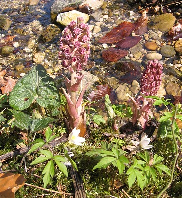 Also der Trümmer da in der Mitte, der rötliche, erinnert mich doch stark an die Gemeine Pestwurz. Das Andere, das Weiße da, könnte eine Art Windröschen sein. Jedenfalls hat es etwas anemonenhaftes an sich.
