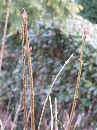 Könnte auch jährige Triebe vom Holunder (nigra) sein, wobei da die Endknospen jedoch meist paarweise angeordnet sind.