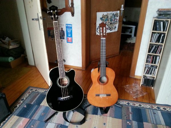 Hier mal ein Bild meiner 2 Gitarren, wobei ich bei den Pfadfindern natürlich nur die Beige Yamaha benutze denn unser Liederbuch ist ja leider nur in Gitarren Akkorden.., das Schwarze mit dem langen Hals ist eine Ibanez AEB8E, eine Akustische Bass Gitarre die ich gerade versuche mir selber beizubringen.. glücklich