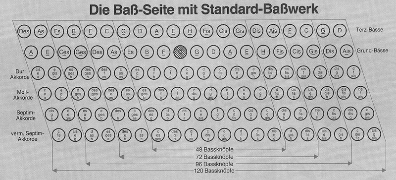 Bei den Piano Akkordeons gibt es typische Anzahlen von Bässen: 48, 72, 96 und 120